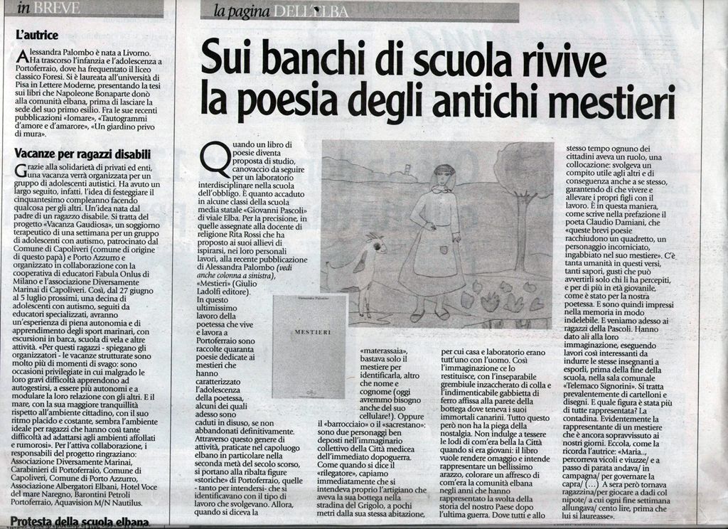 Quando un libro di poesie diventa materia di studio, canovaccio da seguire per un laboratorio interdisciplinare nella scuola dell'obbligo. E' quanto accaduto in alcune classi della scuola media statale "Giovanni Pascoli" di viale Elba. Per la precisione, in quelle assegnate alle docente in religione Rita Rossi che ha proposto ai suoi allievi di ispirarsi, nei loro personali lavori, alla recente pubblicazione di Alessandra Palombo "Mestieri".
