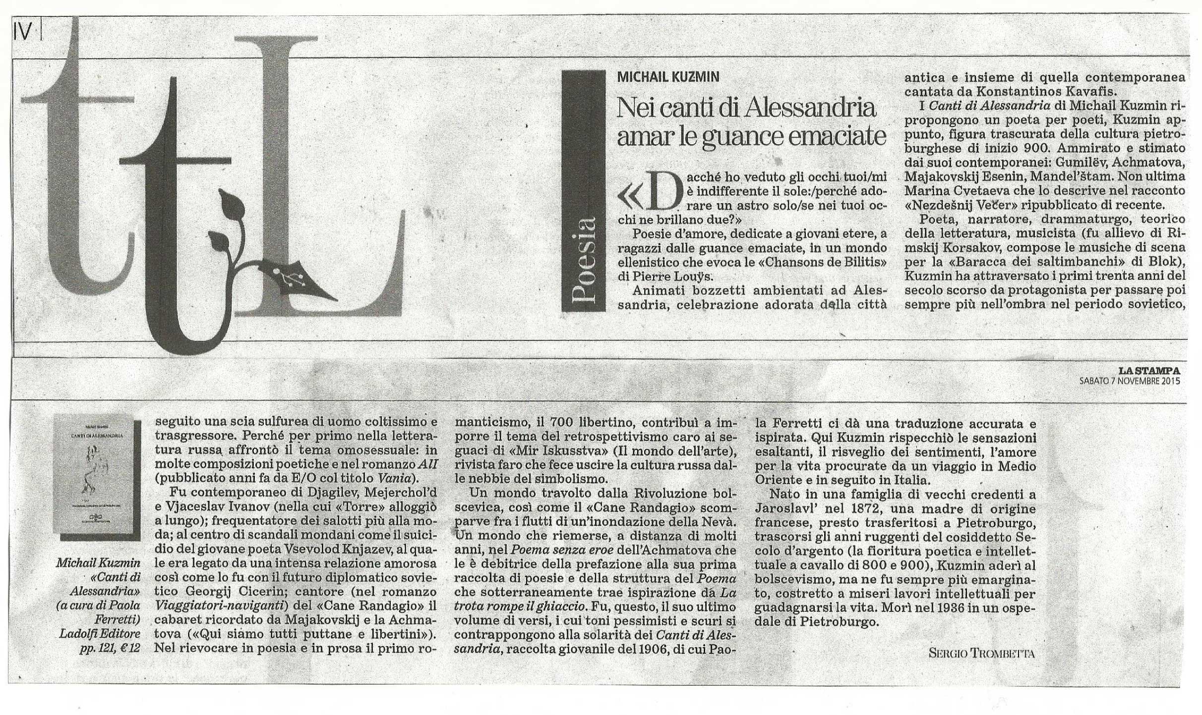 Blog 12 Novembre 2015 Visite: 1922 "Canti di Alessandria" (Kuzmin) su TUTTO LIBRI - LA STAMPA Stampa Email Prec Succ Aggiungi commento Nome (richiesto) E-Mail (richiesta) Sito web Notificami i commenti successivi Aggiorna Invia Annulla
