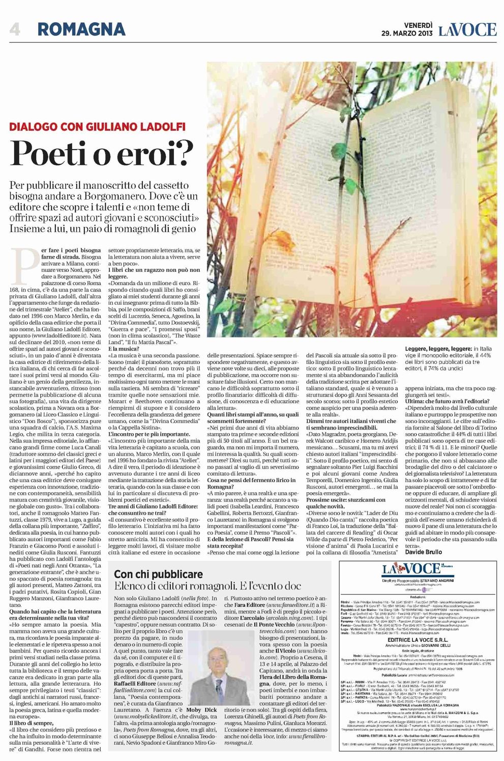 Per fare i poeti bisogna farne di strada. Bisogna arrivare a Milano, continuate verso Nord, approdare a Borgomanero. Nel palazzone di corso Roma 168, in cima, c'è da una pane la casa privata di Giuliano Ladoltì, dall'altra l'appartamento che funge da redazione del trimestrale 'Atelier", die ha fondato nel 1996 con Marco Merlili, e da opificio della casa editrice che porta il suo nome, la Giuliano Ladolfi Editore, appunto (www.ladolfleditore.it]. Nata sul declinare del 2010, «non teme di offrire spazi ad autori giovani e sconosciuti», in un paio d'anni è diventata la casa editrice di riferimento della lirica italiana, di chi cerca di fai' ascoltare i suoi primi versi al mondo.
