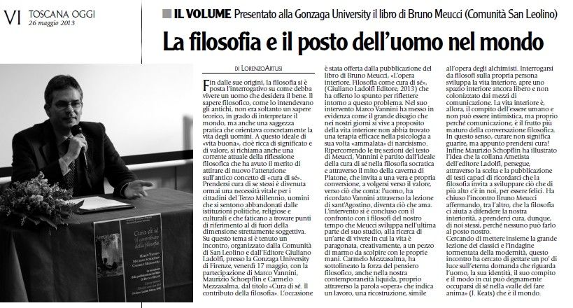 L'occasione è stata offerta dalla pubblicazione del libro di Bruno Meucci, «L'opera intcriore. Filosofia come cura di sé», (Giuliano Ladolfi Editore, 2013) che ha offerto lo spunto per riflettere intorno a questo problema. Nel suo intervento Marco Vannini ha messo in evidenza come il grande disagio che nei nostri giorni si vive a proposito della vita interiore non abbia trovato una terapia efficace nella psicologia a sua volta «ammalata» di narcisismo. Ripercorrendo le tre sezioni del testo di Meucci, Vannini è partito dall'ideale della cura di sé nella filosofia socratica e attraverso il mito della caverna di Piatone, che invita a una vera e propria conversione, a volgersi verso il valore, verso ciò che conta: l'uomo, ha ricordato Vannini attraverso la lezione di sant'Agostino, diventa ciò che ama. L'intervento si è concluso con il confronto con i filosofi del nostro tempo che Meucci sviluppa nell'ultima parte del suo studio, alla ricerca di un'arte di vivere in cui la vita è paragonata, creativamente, a un pezzo di marmo da scolpire con le proprie mani.